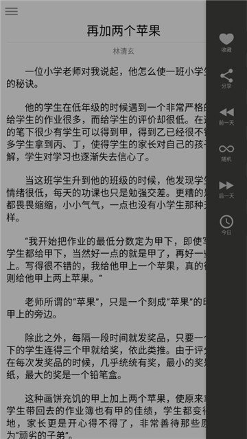 这款软件里的文章词句大多围绕修心展开,希望读者变成更好的自己,拥有更加平和的心态去面对生活。软件阅读界面的配色很朴素,文章的字体大小和亮度也能调节,再配上一些轻松的音乐,阅读体验极佳。当你遇到有趣的散文,收藏功能用起来也很方便,还能按照收藏时间或文章种类进行整理。