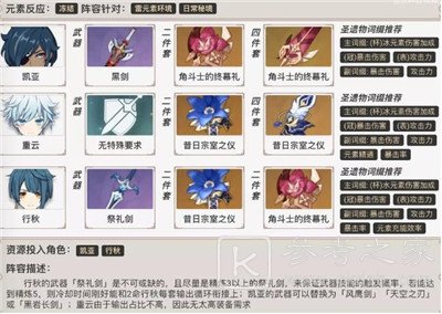 「祭礼剑」精炼1就可以用,但是最好能在精炼3以上,高精炼的祭礼剑可以保证武器技能的刷新效果更稳定。虽然使用祭礼剑会导致元素爆发的伤害低于佩戴五星武器,但祭礼剑的元素充能效率和刷新元素战技多打元素微粒是这套打法必须的,且两发元素战技连发一定程度上可以弥补五星武器的高面板带来的伤害差距。