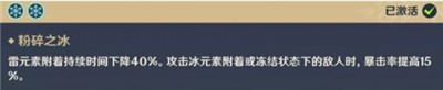 其中「粉碎之冰 」可以在攻击冰元素附着或冻结状态的敌人时获得15%暴击率的正反馈,并减少角色身上40%雷元素持续附着时间,该加成的判定对象是怪物,因此可以给全队吃到暴击率的增益效果,且无关先后手的快照机制