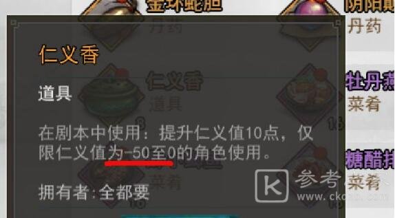 需要注意使用范围,如果不小心-60仁义了,那就只有先去做两个主城的任务,一次回复5点,为什么要用仁义香,第一,主城任务一次只加五点,第二,主城任务后面会频繁的让你去各种迷宫里找人找物.