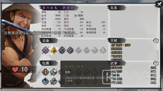 2、前往衡山寻找黄河水鬼·郎白条,通过观察可以发现他的包裹内有群侠传之地卷;可通过乞讨、切磋、决斗获得