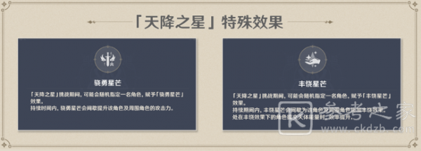 「天降之星」挑战期间,可能会不定期随机赋予一个角色特殊效果,特殊效果分为「骁勇星芒」与「丰饶星芒」。