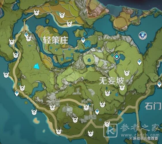 上图就是可以供各位玩家进行参考的轻策庄熄星能量的大致分布点位标记图,图中共标出了20个陨石的位置。