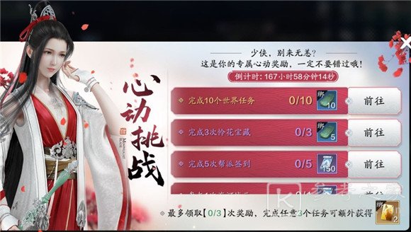 以上内容就是今天小编为各位玩家小伙伴带来的天涯明月刀手游中的心动挑战触发方法介绍了,大家可以完成刷新的任务获取奖励,这个活动不是每个玩家小伙伴都能触发的,运气好才会触发的哦。